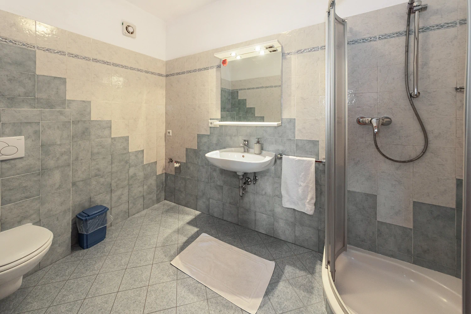 • Bathroom with washbasin, WC, shower and hairdryer