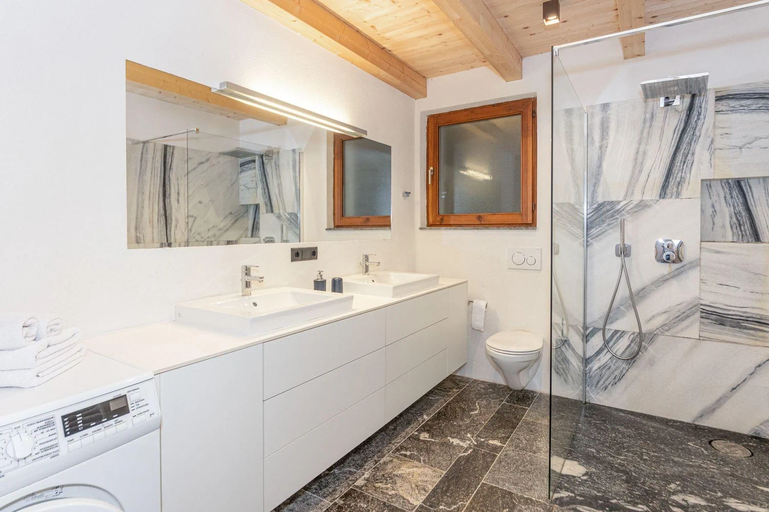 • Bagno con lavabo (due lavandini), WC, doccia e asciugacapelli